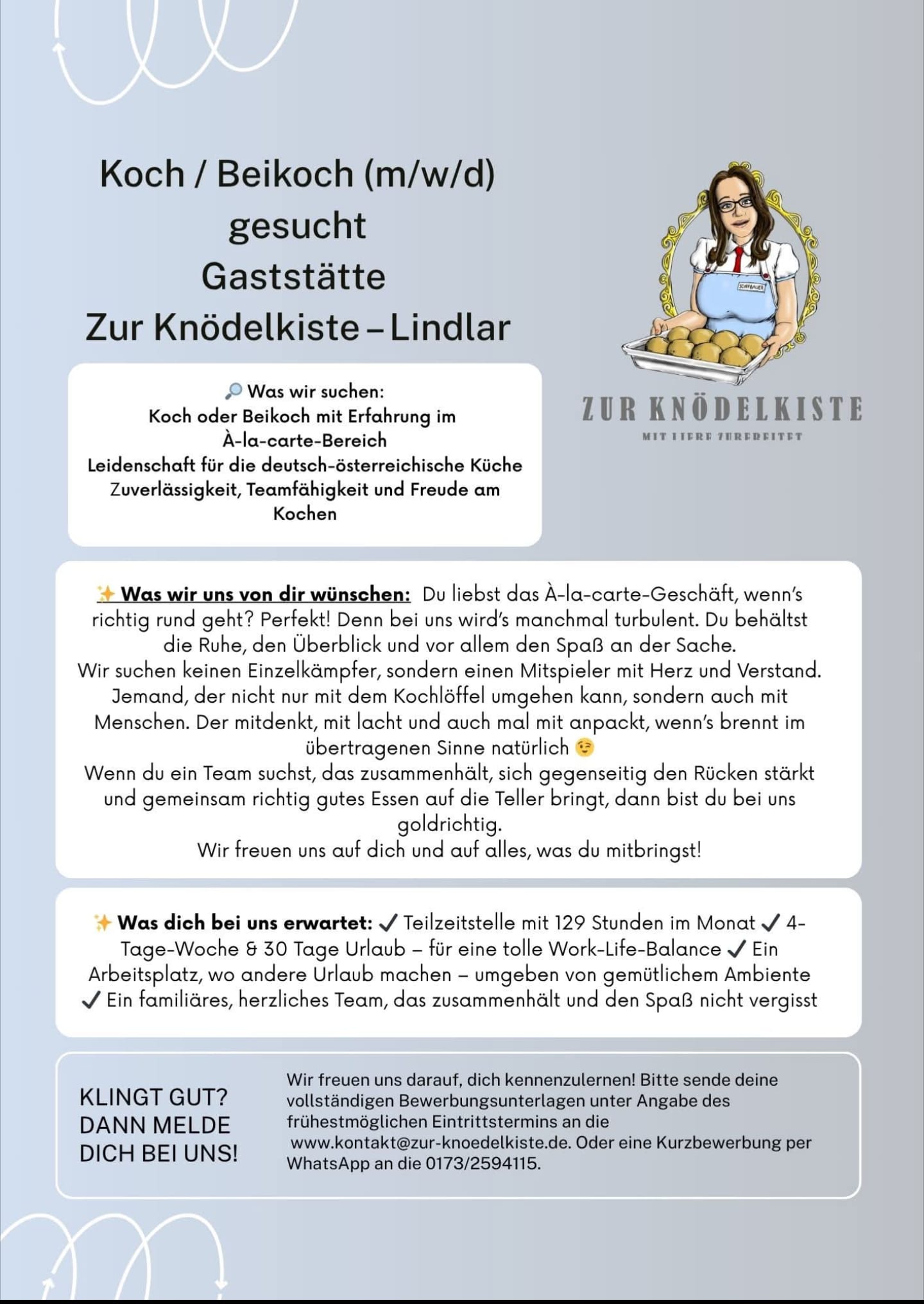 Willkommen bei der Knödelkiste! Wir sind nicht nur für unsere leckeren Knödel bekannt, sondern auch für das familiäre und freundliche Arbeitsumfeld. Wenn du Lust auf einen Job in der Gastronomie hast, bei dem Herzlichkeit und Teamgeist großgeschrieben werden, dann bist du bei uns genau richtig.